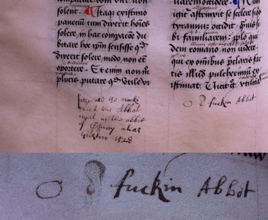 Ah, but what about the ‘F’ word, I hear you say. Well, it has a surprisingly long history, revealed to me in the occasional digging on the subject by the Open Culture website. Back in 2014, the following bold title appeared: ‘The Very First Use of the F word in English (1528)’. Yes, the phrase ‘fuckin abbot’ appears in the marginalia of Cicero’s De Officiis, a guide to moral conduct. It’s apparently the words of a monk expressing his displeasure at an abbot.